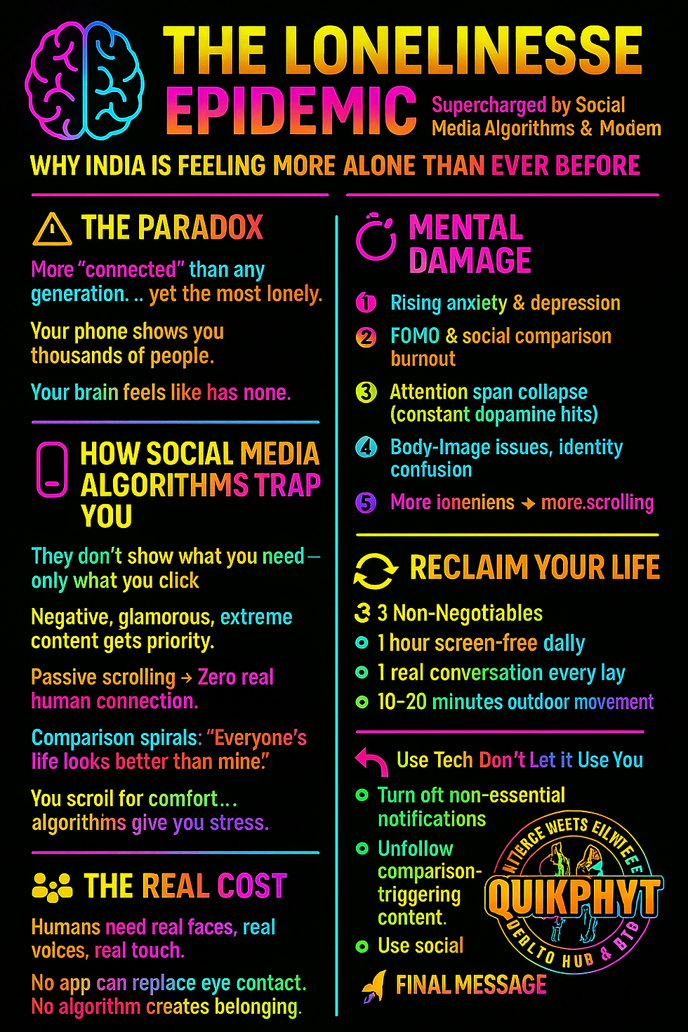 You are not weak for being affected by these systems—they are built to capture the human brain. But with awareness and structured habits, you can step out of the digital loneliness spiral and build a life where technology serves your relationships, not the other way around.